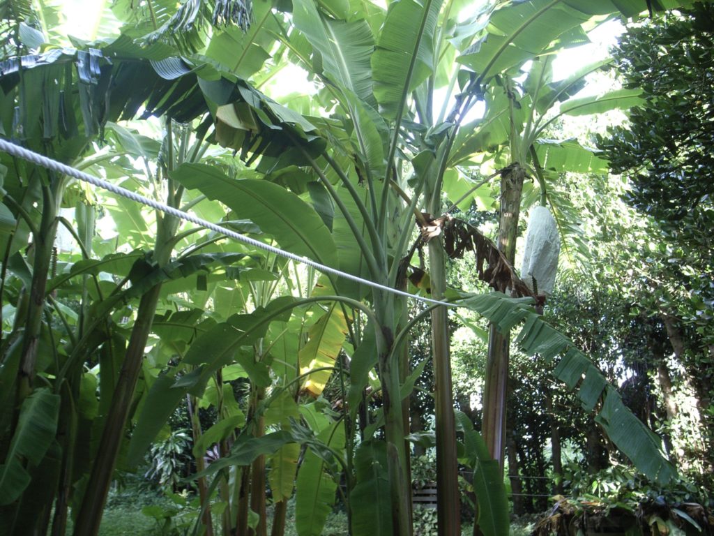 それを防ぐために、実のついたアップルバナナと防風林の木をロープで結んで倒れるのを防ぐ方法もあります。