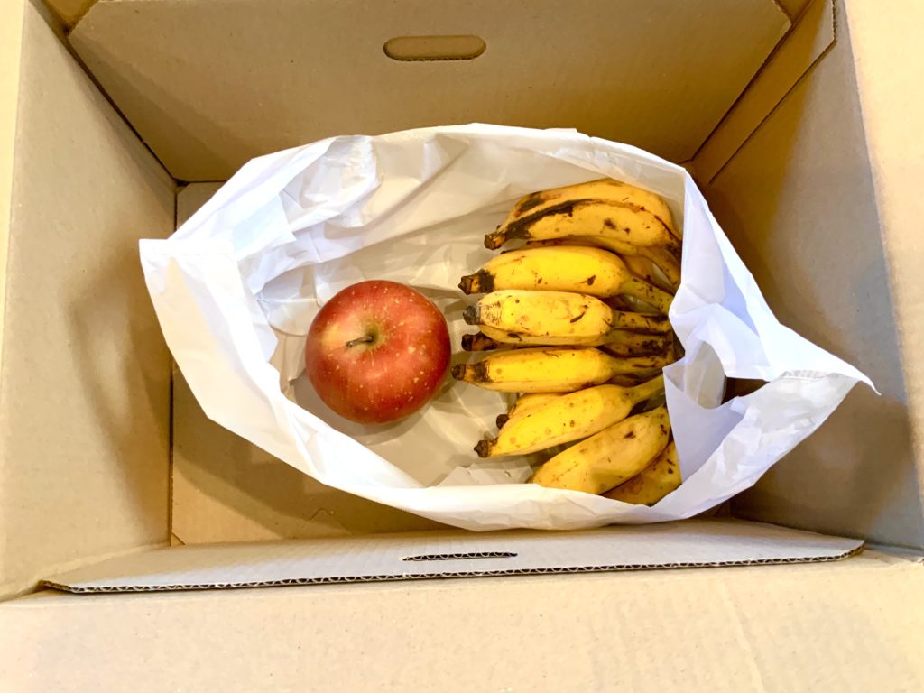 もう1つの要素は、熟成時にバナナ自体から発生するエチレンというガスの濃度です。なので、早く熟成させたければ密閉状態にしてエチレン濃度を高めるという方法がおすすめです。さらに、リンゴを1つ入れるとリンゴから発生するエチレンによってさらに熟成が早まります。