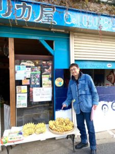 キングコブラ大塚の畑で穫れたアップルバナナを販売。通りがかりの人が試食用を1本食べて、房を購入してくれるというパターンでわずか3時間で完売